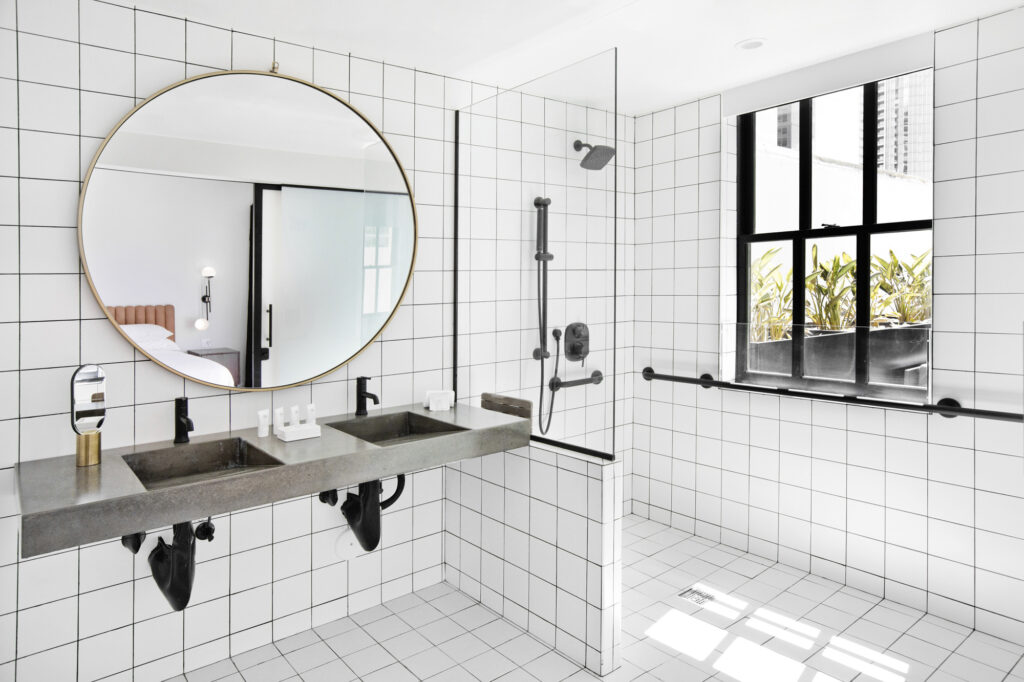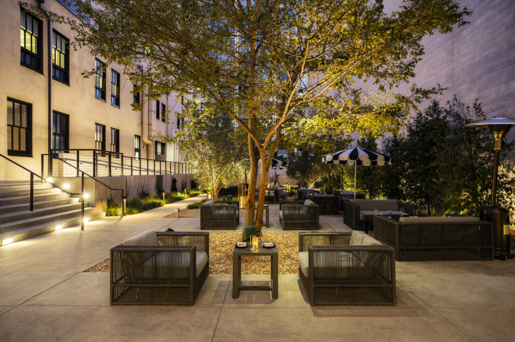 The renovation introduced 162 guest rooms featuring exposed concrete ceilings, custom millwork, and built-in furnishings that highlight the structure’s historic character. Public spaces include the Guild Bar, finished with Brazilian leathered quartzite and tailored detailing, and Luca, a full-service restaurant with indoor seating and a landscaped open-air courtyard. Grace Garden, an urban outdoor lounge, provides a flexible setting for social gatherings.